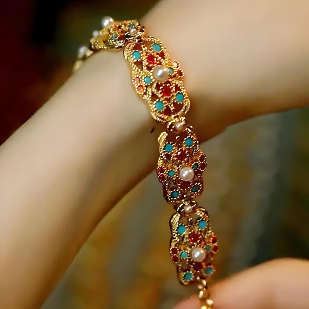 La collection "Gilded Reverie" de Velshine présente un bracelet à breloques vintage en or coloré qui exsude la beauté de la vie. fantaisie et élégance. Ce bracelet enchanteur est orné de pierres précieuses scintillantes, semblables à des étoiles scintillant dans le ciel nocturne.